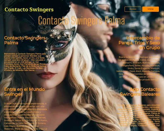 Contactos Swinger Palma para parejas swinger y personas liberales que buscan hacer un trío, intercambio de pareja o sexo en grupo en Palma, Calviá, Lluchmayor, Marrachí, Andrach, Buñola, Esporlas, Puigpuñent, Sóller, Alcudia, Manacor, Sinéu, Santa Eugenia, Montuiri, Valldemosa, Deyá, Alaró, Algaida, Campos, Inca, Artá,...Encuentra parejas y solteros que quieren intercambiar pareja para relaciones sexuales o tener sexo en grupo con matrimonios liberales, parejas maduras y singles. Desde el Soft Swap hasta el Full Swap en fiestas swinger, blizz, exhibicionismo y voyeurismo, dogging, citas swinger, juegos de rol, sexo en lugares públicos en el mejor ambiente swinger. Contacto Swinger Palma, parejas liberales, tríos Baleares, sexo en grupo, intercambio de pareja, matrimonios liberales, senior swinger, parejas maduras, parejas swinger, singles, relaciones sexuales, soft swap, full swap, fiestas swinger, blizz, exhibicionismo, dogging, sexo en lugares públicos, swinger party,, sexo ocasional, citas swinger, ambiente swinger en Palma, Plaza de los Patines, Sindicato, Jaime III, Son Cotoner, El Fortín, Campo de Serralta, Son Serra, El Terreno, Cala Mayor, Buenos Aires, Campo Redondo, Plaza de Toros, El Rafal Viejo, La Soledad, Pedro Garau, Foners, Son Ferriol, Coll de Rebasa, El Arenal,...Contacto Swinger en Palma.