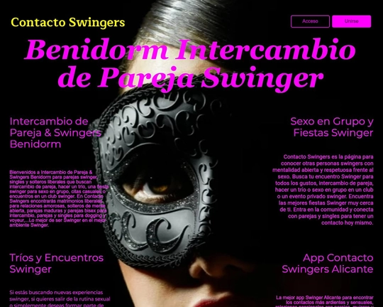 Intercambio de Pareja Benidorm para parejas swinger y personas solteras que buscan hacer un trío, intercambio de pareja o sexo en grupo en Benidorm, Alcoy, Elda, Denia, Santa Pola, Petrer, Villena, Crevillente, Campello, Jávea, Muchamiel, Novelda, San Juan de Alicante, Ibi, Altea, Pilar de la Horadada, Almoradí,,..Encuentra parejas liberales, singles, mujeres bisexuales, dogging, matrimonios con deseo de experimentar un tríos, parejas bisexuales, mujeres para trío y contactos swinger que quieren intercambiar pareja para relaciones sexuales o tener sexo en grupo. Desde el Soft Swap hasta el Full Swap en fiestas swinger, exhibicionismo y voyeurismo, citas swinger, juegos de rol, swinger BDSM y Fetish swinger, sexo en lugares públicos en el mejor ambiente swinger. Benidorm Intercambio de Pareja, parejas liberales Alicante, parejas bi, mujeres bisexuales, contactos swinger, tríos, sexo en grupo, intercambio de pareja, parejas bisex, parejas swinger, singles, dogging, relaciones sexuales, soft swap, full swap, fiestas swinger, exhibicionismo, sexo en lugares públicos, swinger party,, sexo ocasional, citas swinger, ambiente swinger. ¡Únete a Contacto Swingers hoy y busca contactos para Intercambio de Pareja ahora en Benidorm, Altea, Guadalest, Calpe, Villajoyosa, Polop, Finestrat, Alfaz del Pi, La Nucia, Alicante, Elche, Orihuela, San Vicente del Raspeig,...!